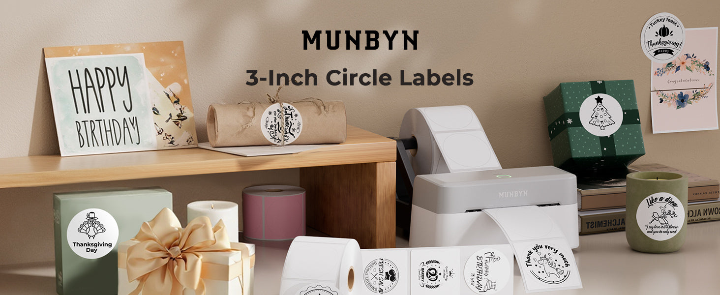 • Munbyn Generic(GR) 3 Inch Labels: Round thermal sticker with the size: 3" circle (500 labels/roll, 1 roll, white), paper tube diameter: 0.98"(25mm), paper roll diameter: 3.38"(86mm), no ink toner or ribbons are needed!