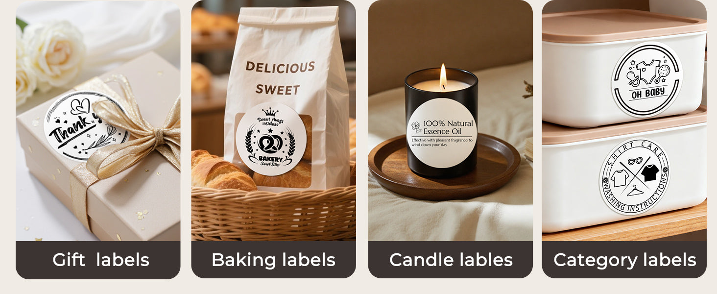 Logo stickers, thank-you labels, QR codes, product info labels.