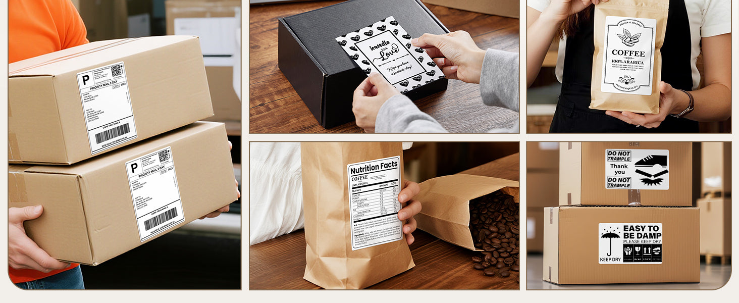 Shipping labels, product tags, barcodes, return labels.