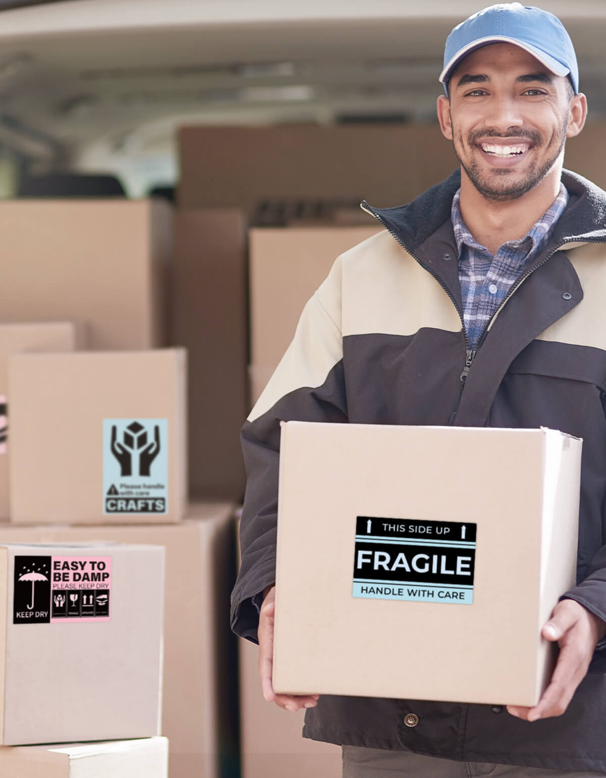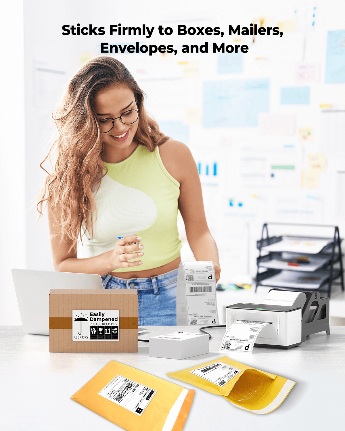 Shipping labels, product tags, barcodes, return labels.