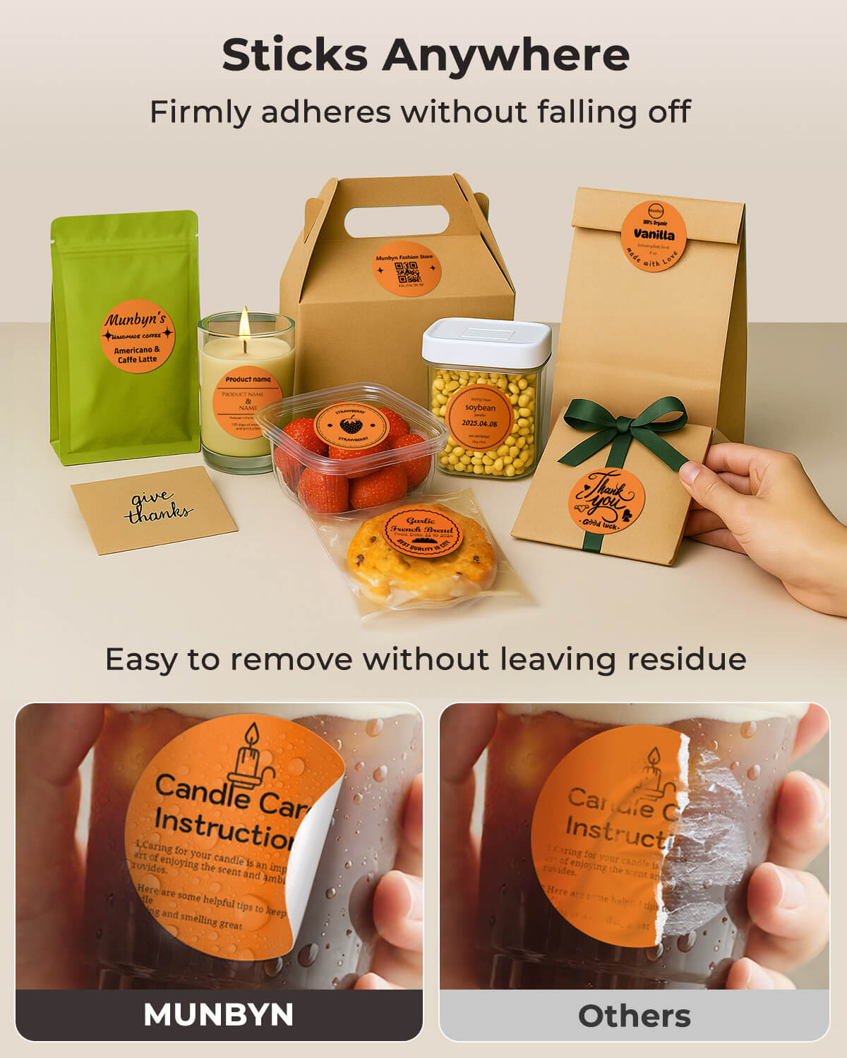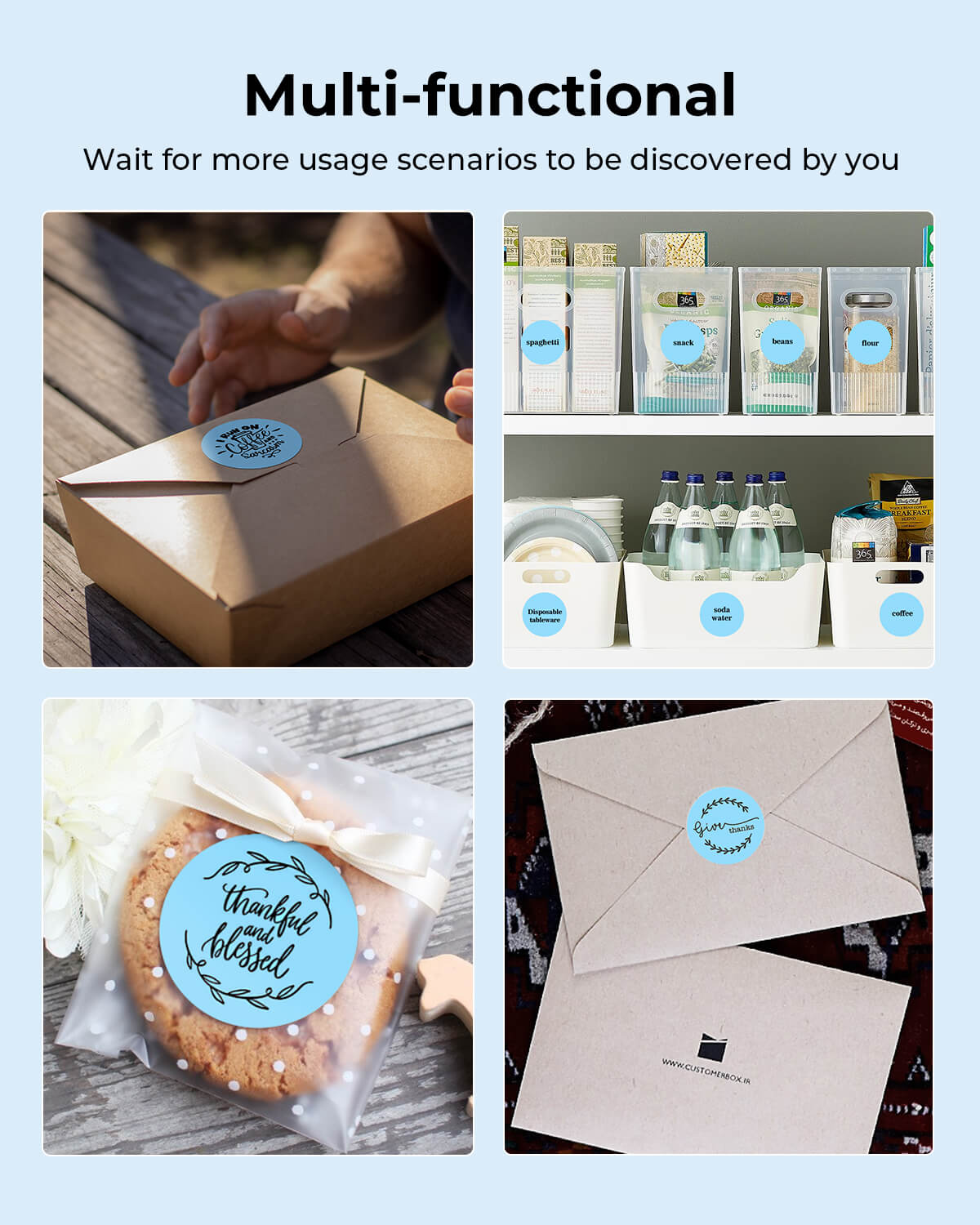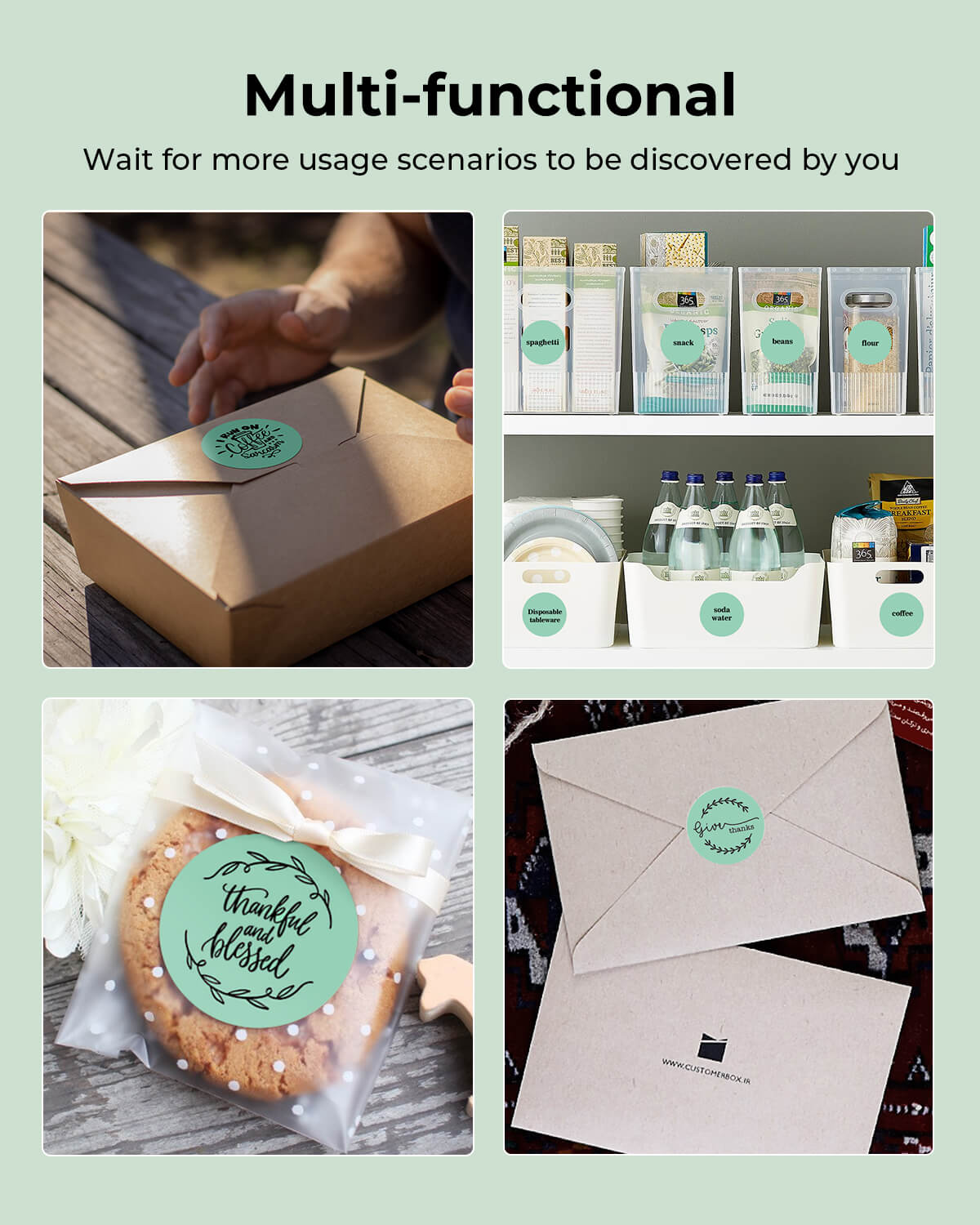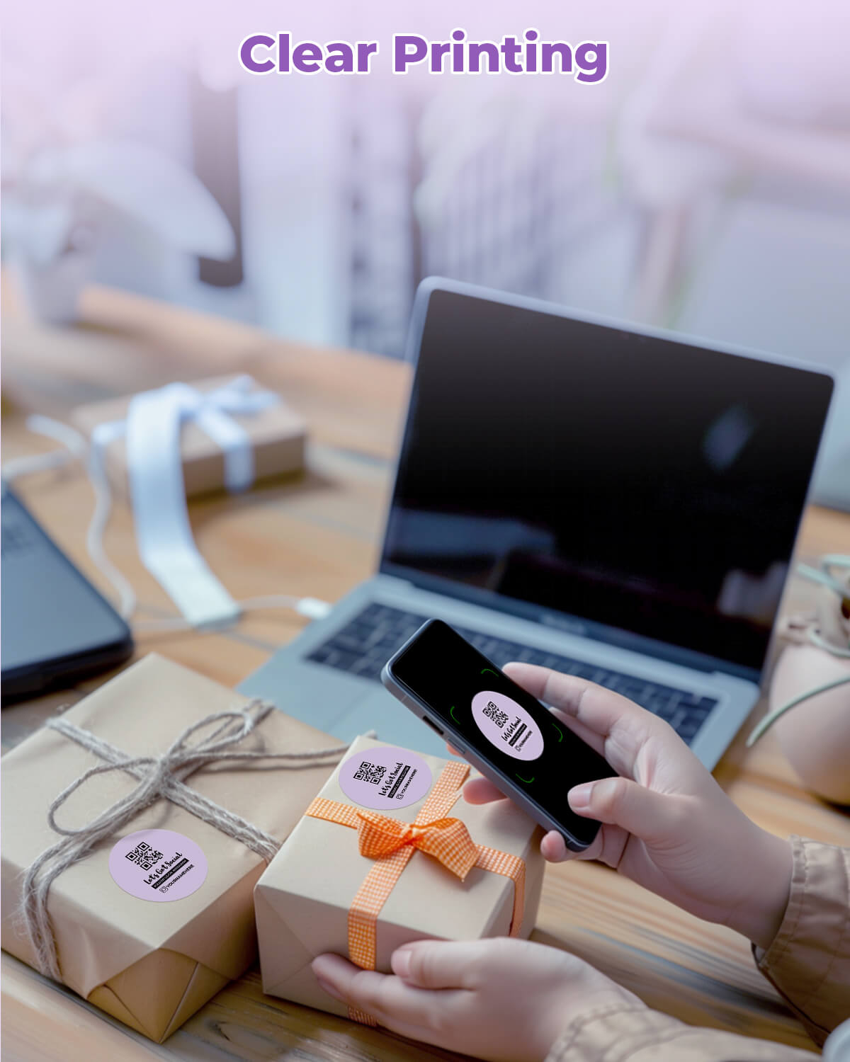 Logo stickers, thank-you labels, QR codes, product info labels.