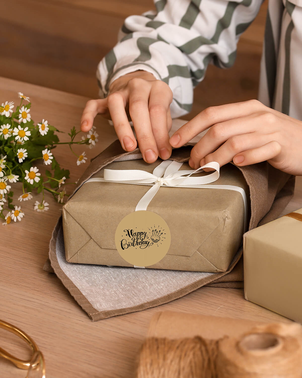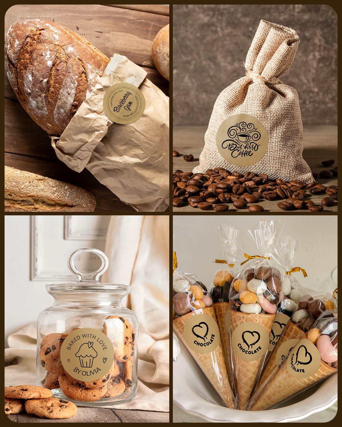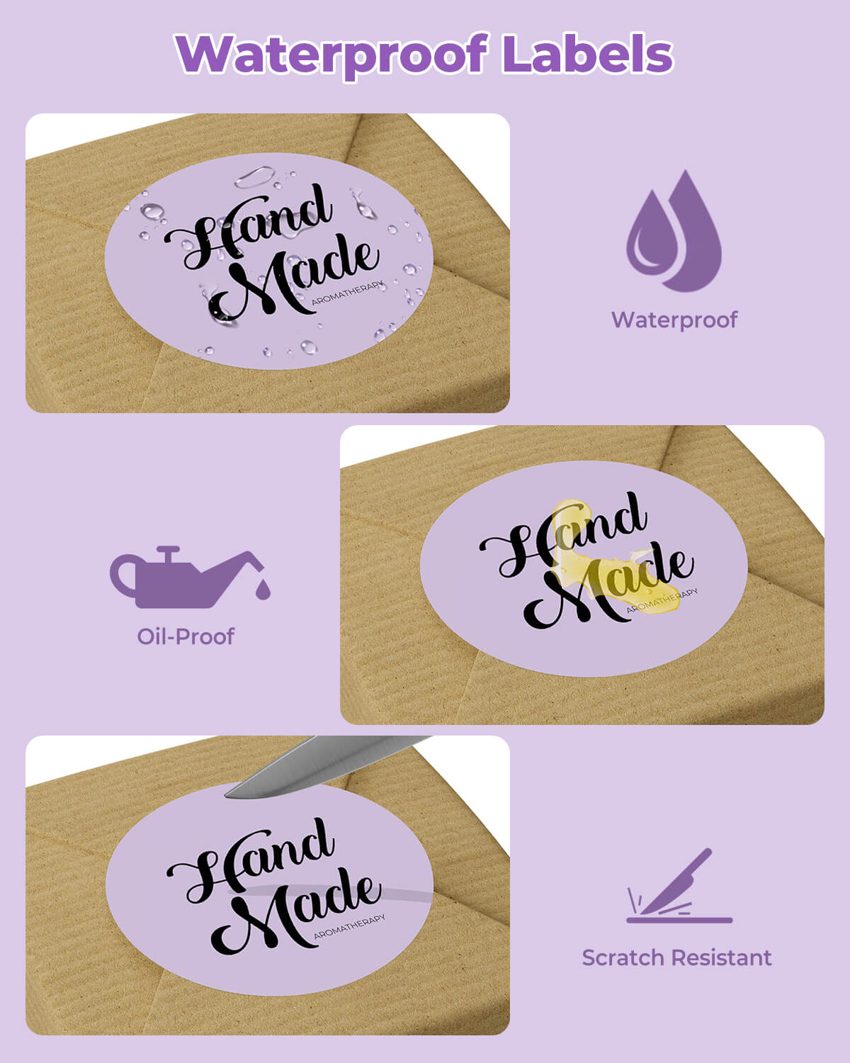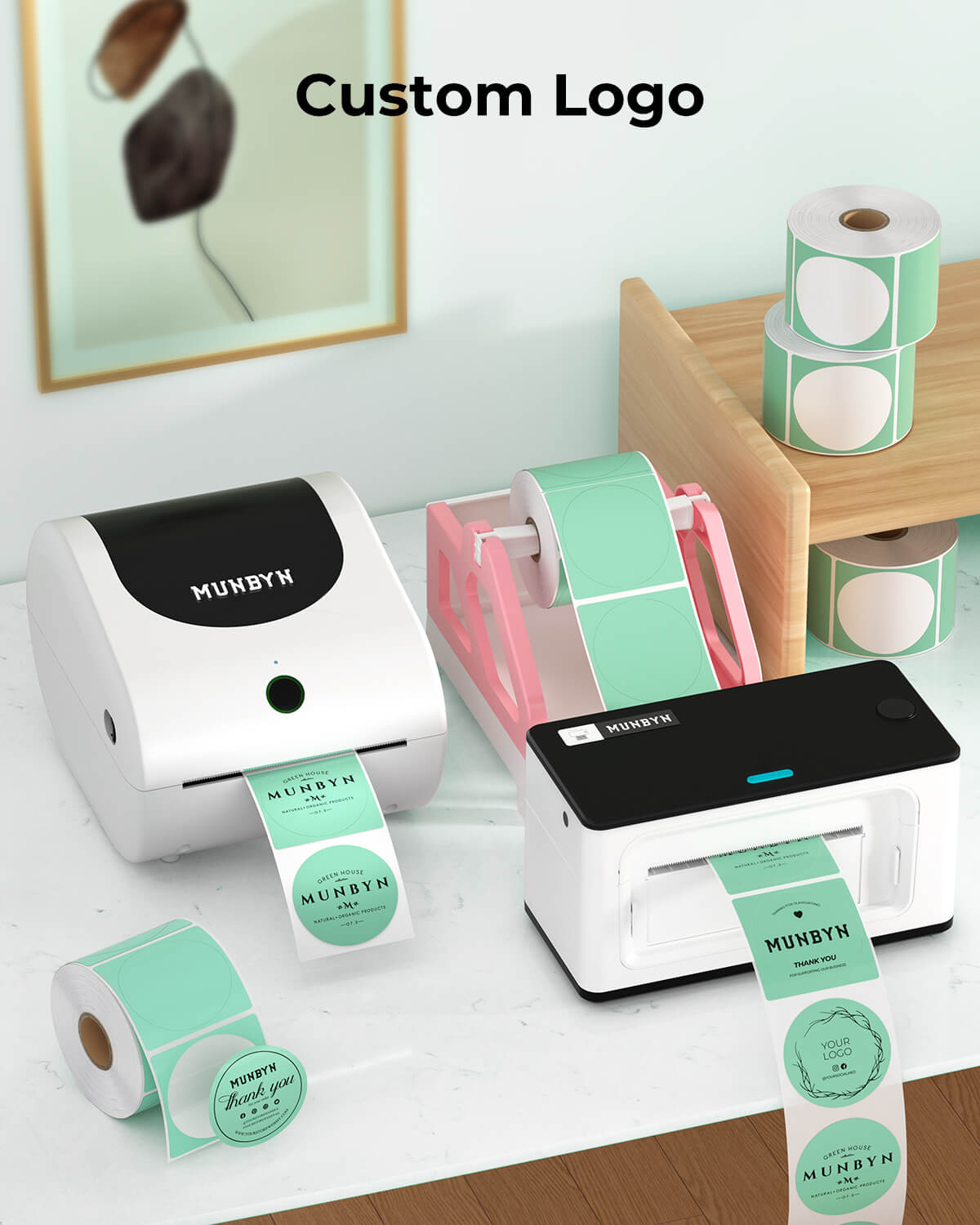 Logo stickers, thank-you labels, QR codes, product info labels.