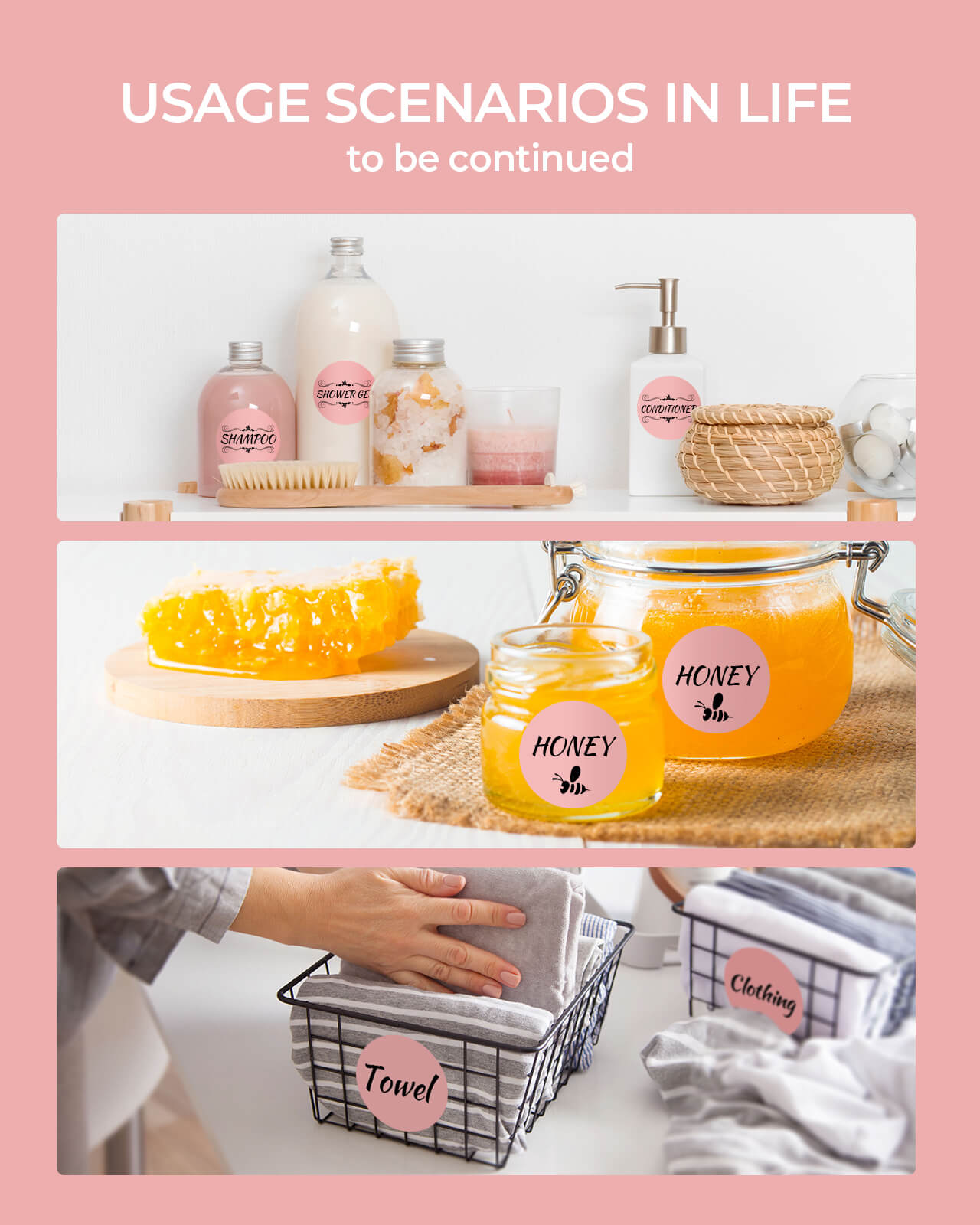 Kitchen containers, storage bins, office folders, kids’ items.