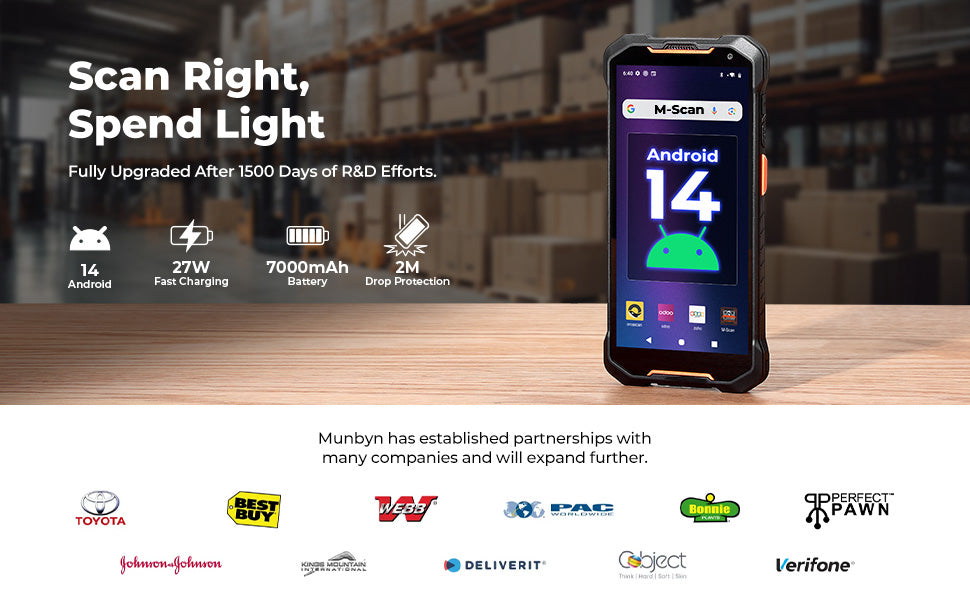 MUNBYN scanners run on Android 12, 13, or 14, depending on the model (AS01P, MC005P, IPDA088, IPDA087P, IPDA101, etc.). All systems support Google services and enterprise apps.