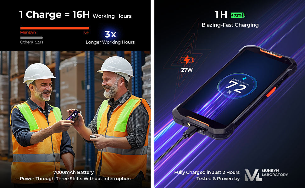 A powerful 7,000 mAh battery provides up to 16 hours of use, while industry-leading 27W fast charging minimizes downtime and boosts productivity.