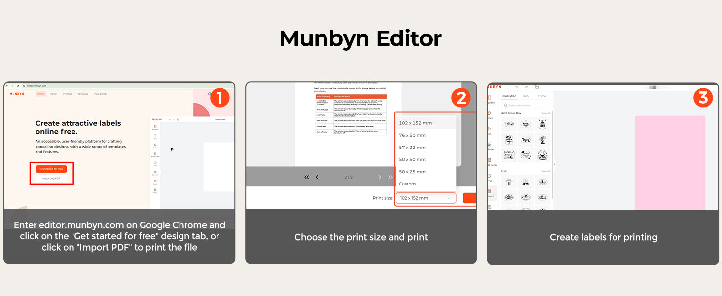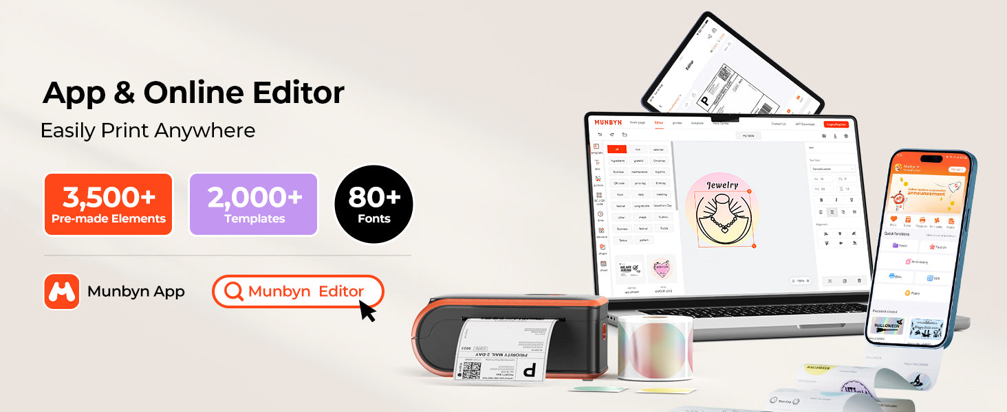 • Simplify Your Printing Tasks – Design labels with the free “MUNBYN Print” app (iOS/Android) or “MUNBYN Editor” (Chrome). Access 3,500+ design elements, 2,000+ templates, 80+ fonts
