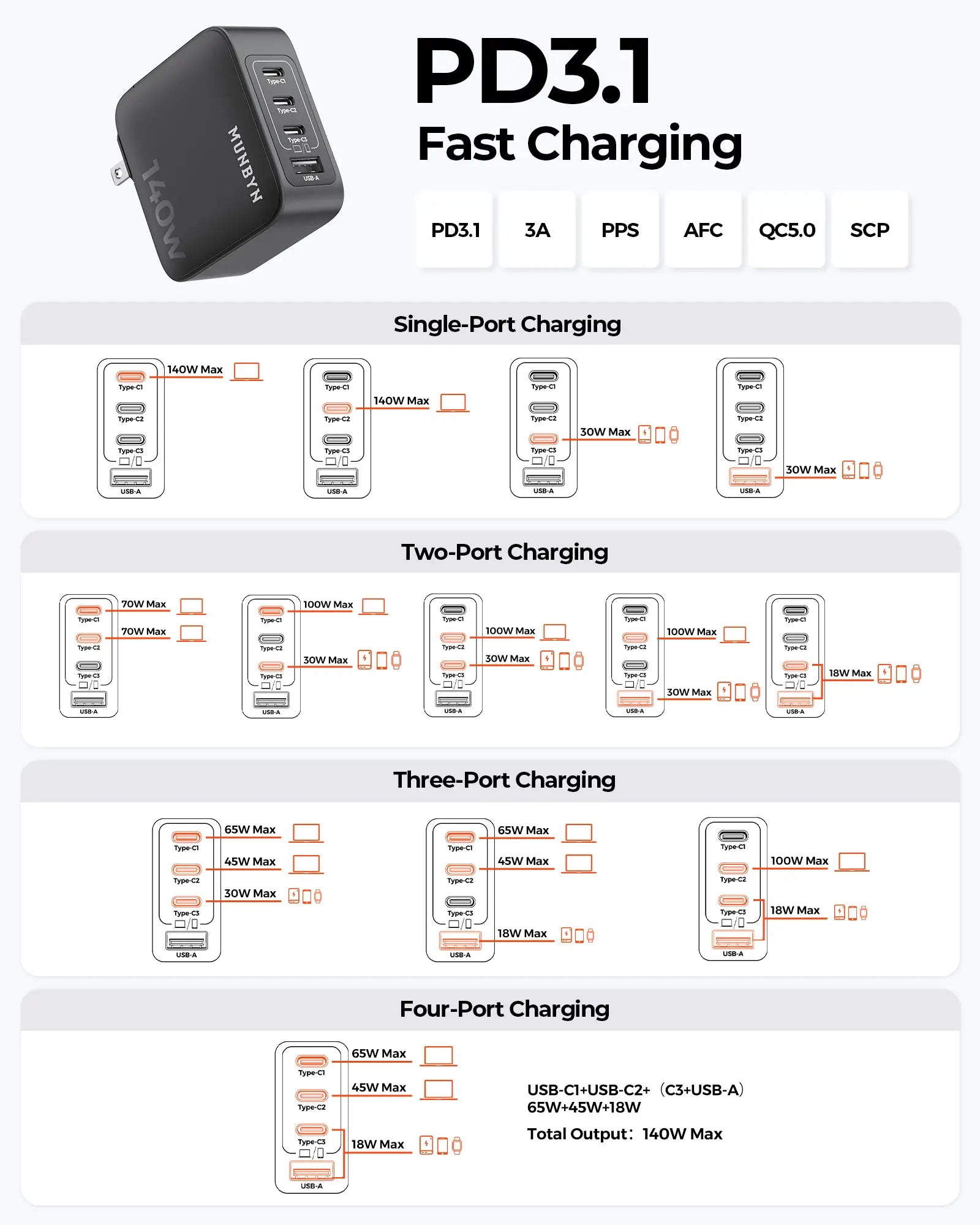 MUNBYN NexTect CR14 140W USB-C 4-Port Fast Charger