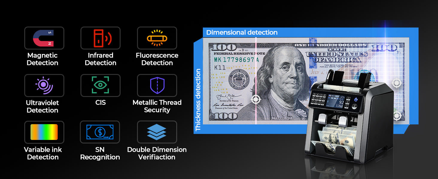 Counterfeit Detection | 2 CIS, UV, IR, MT, MG, Dimensional & Thickness, Security Line, Variable Ink, Spectrum, Fluorescence, Serial Number Recognition (12 methods) |