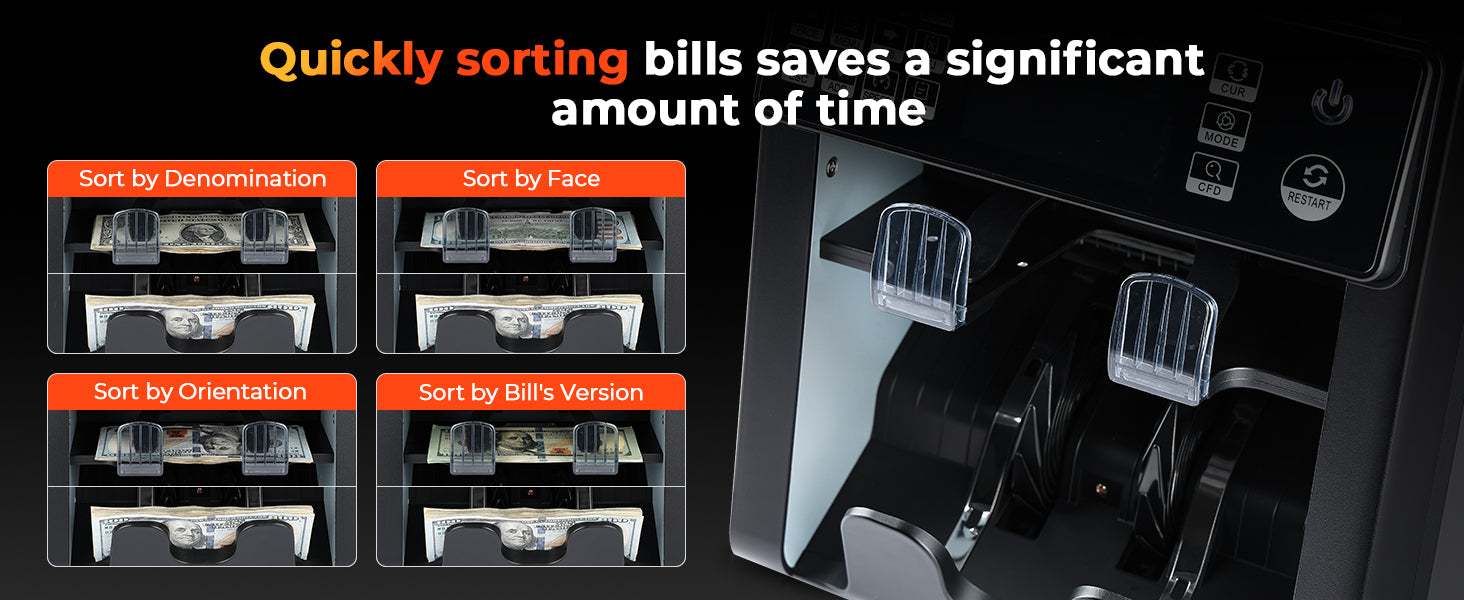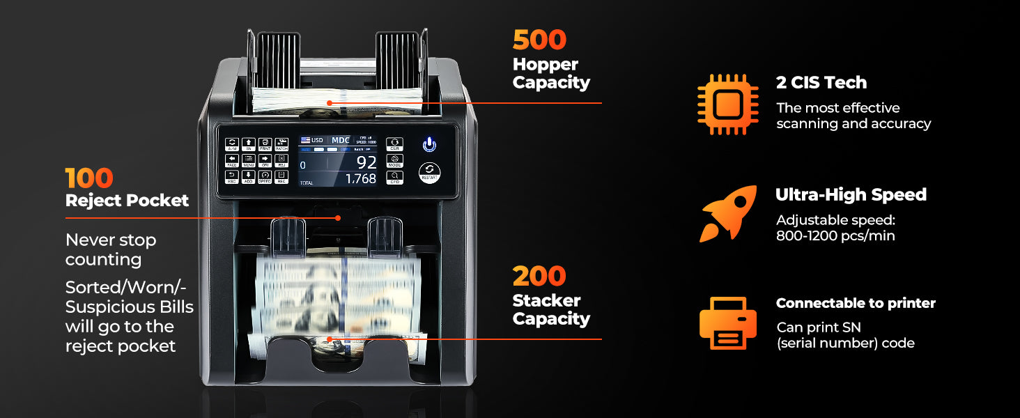 Counting Modes | Mixed Denomination Counting, Sorting, ADD, BATCH, ADD & BATCH, Auto / Manual Counting |