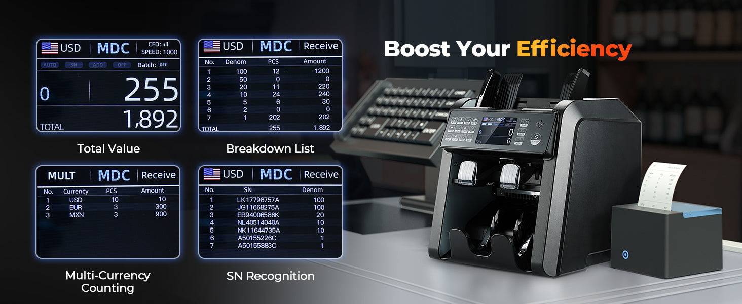 Multi-Currency Support | Supports 4 mixed currencies in one count (USD, EUR, CAD, MXN, LBP, etc.); Up to 120+ currencies with software updates |