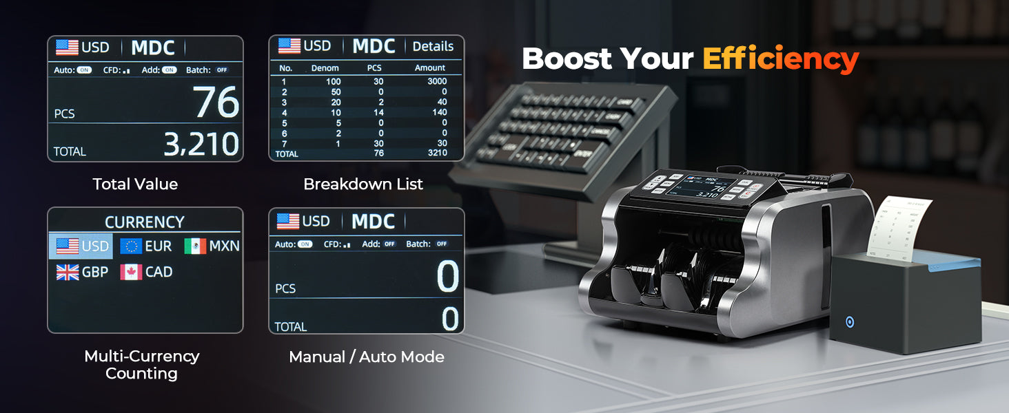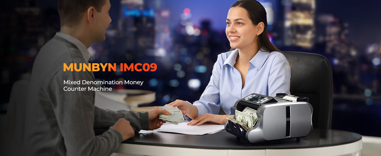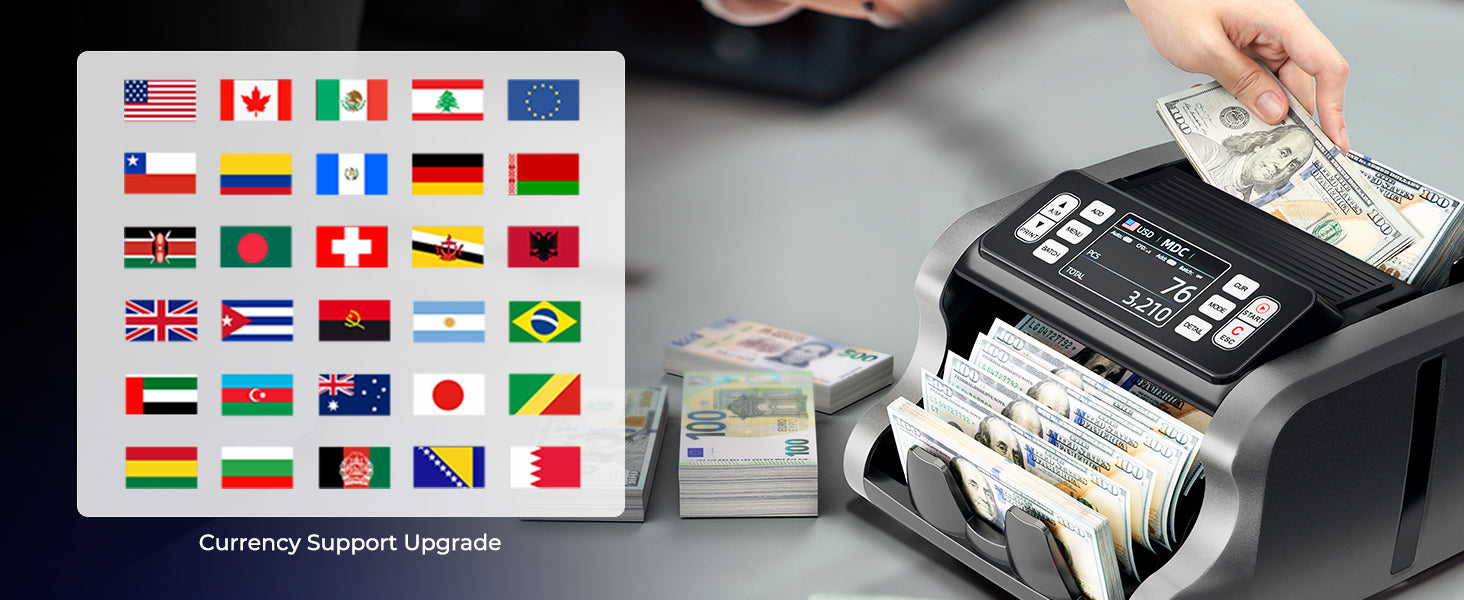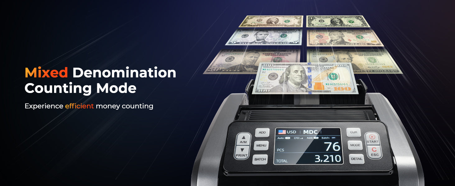 - [Mixed Denomination&Multi Currency] Just put your money into the machine and turn to Mixed Denomination Counting mode(MDC mode), this mixed denomination money counter machine will give you the value and quantity of the bills. Besides, IMC09 supports multi-currency value counting(USD/MXN/CAD/EUR/etc) and is equipped with a 3.5” TFT display screen