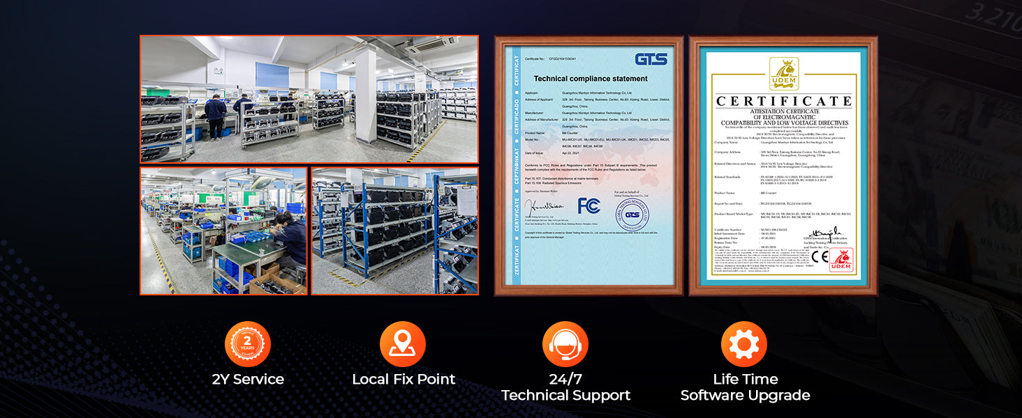 - [Technical Support] Committed to providing a comprehensive money-handling solution, MUNBYN has a complete product line and technical assurance. For all our products, we provide- ①Technical support replies within 2 hours. ②Two years of quality protection. If you need repair services, our local centers(within the United States)are available to assist you. Get in touch with us. ③Lifetime upgrade program for the new versions or currencies bills.