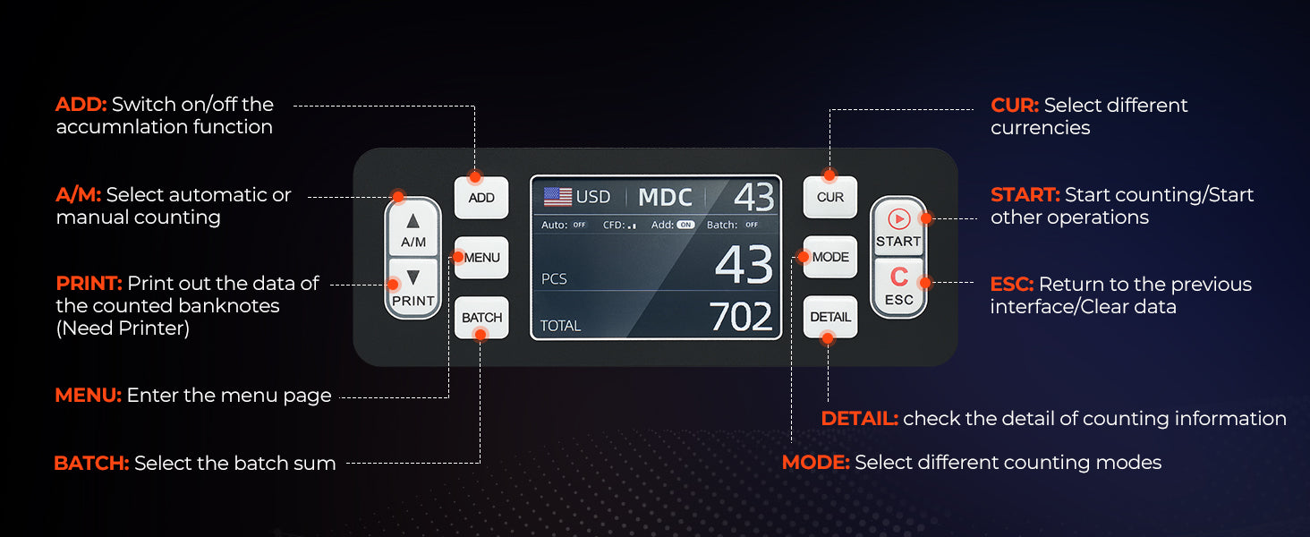 - [Bank-Grade Counterfeit Detection] With 2 special Infrared Detection tubes, our money counting machine uses UV/IR/MG/MT detecting technology to examine the bills. Using Magnetic, Infrared, Ultraviolet, Dimensional, Thickness, Security Line, Variable Ink, Spectrum, and Fluorescence Detection techniques to completely protect your company from false bills