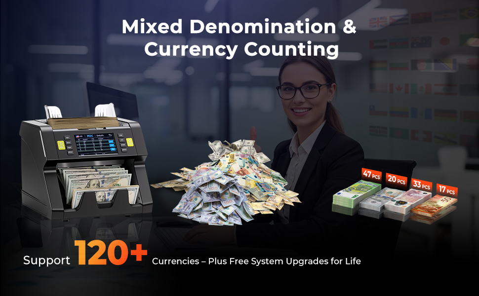 - 4 kinds of currencies with the mixed denomination at the one-time count. You can count a stack of mixed USD, CAD, EUR, MXN at only one count.