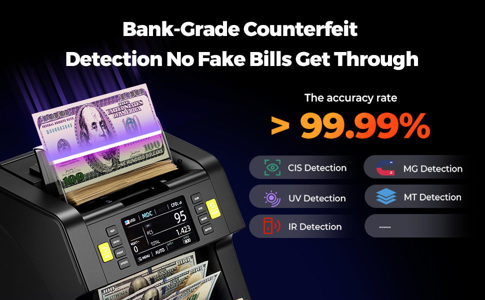 Bank-Grade Counterfeit Detection: Provides 11 counterfeit detection methods to guard your business, including CIS, UV, IR, MT, MG, Dimensional and Thickness Detection, Security Line Detection, Variable ink Detection, Spectrum Detection, Fluorescence Detection.