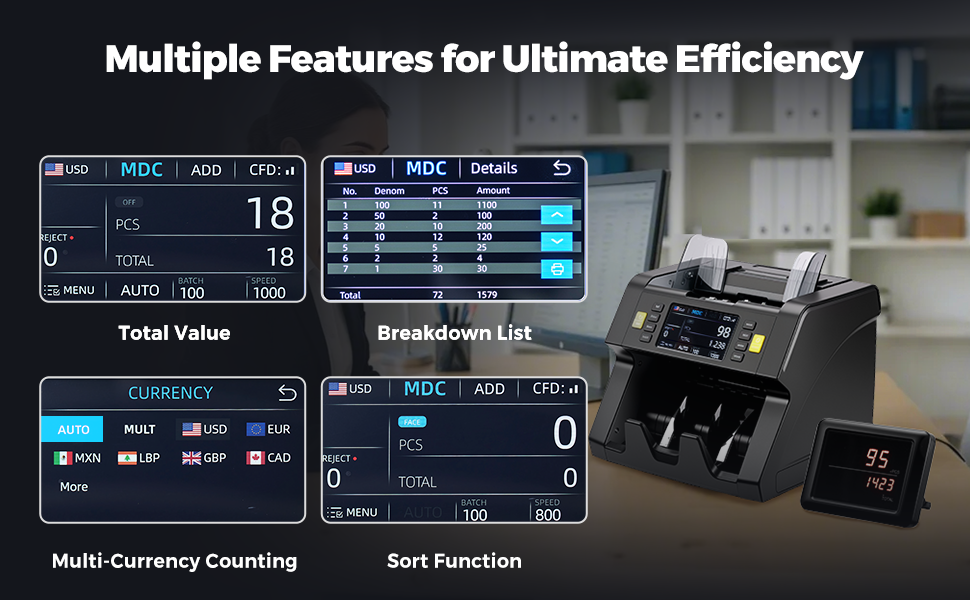- Money counter machine mixed denomination provides clear lists including the number of bills & value by bills denominations for better money management.