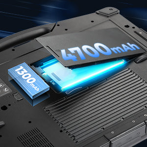 MUNBYN military computer has dual batteries: a 4700 mAh replaceable battery and a built-in 1300 mAh battery (6000 mAh total). The hot-swappable feature ensures seamless battery replacement without shutdown, maintaining productivity and data security.