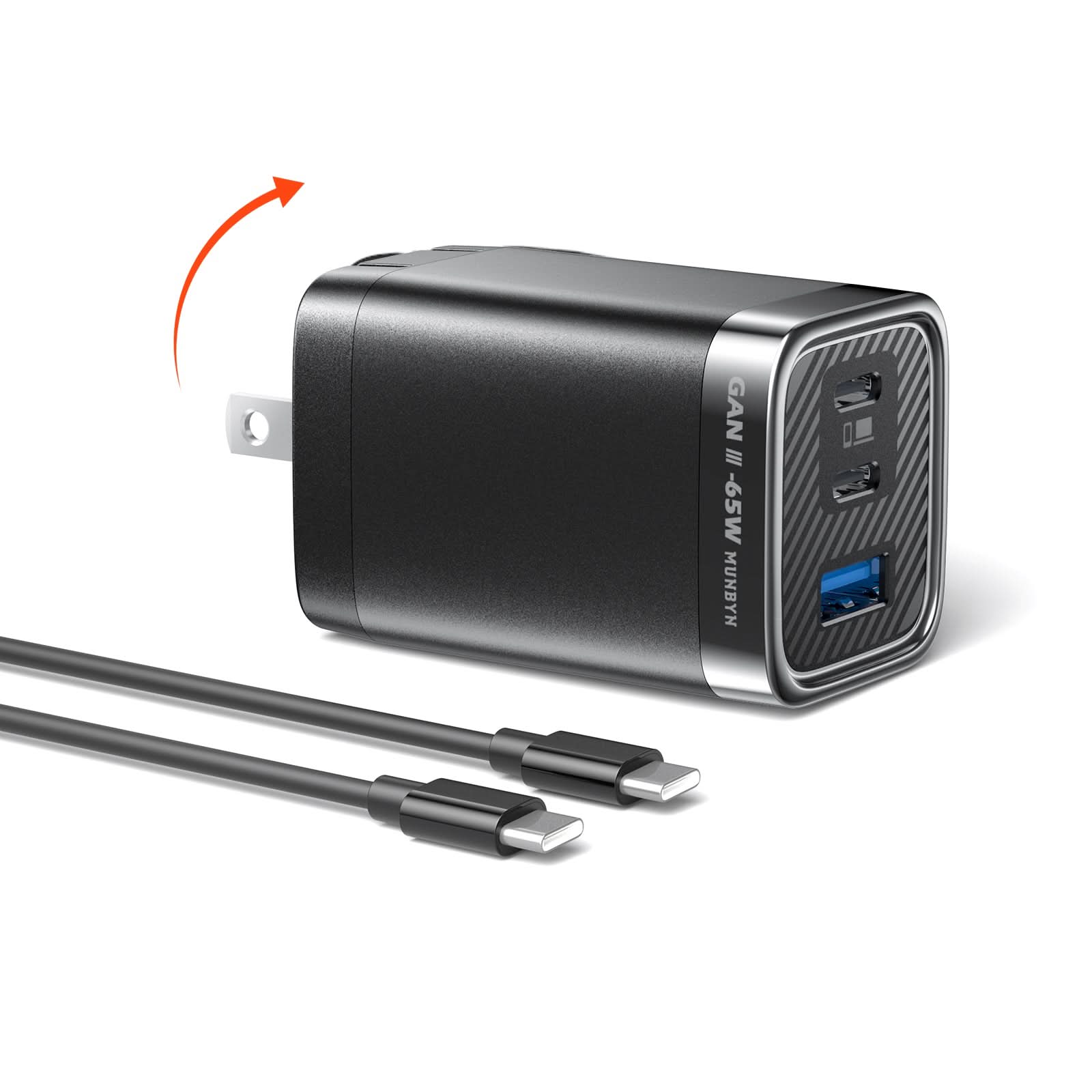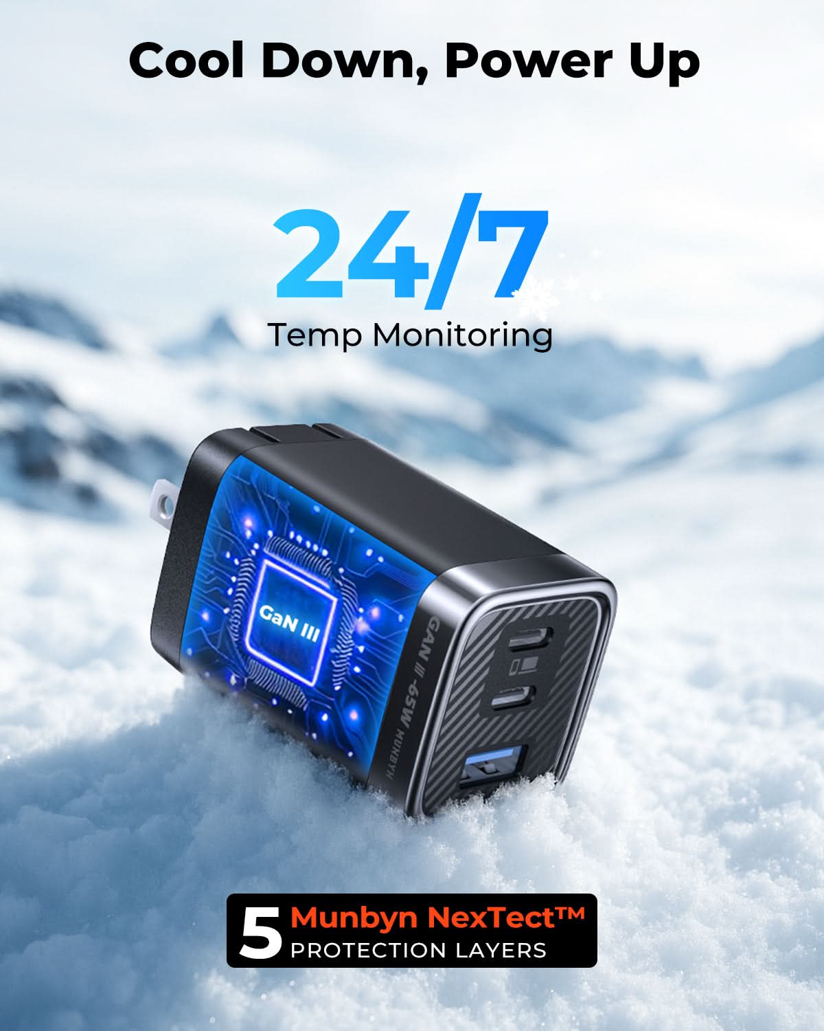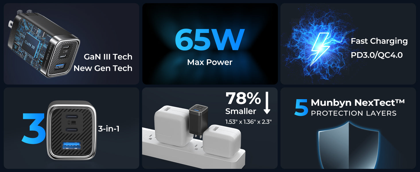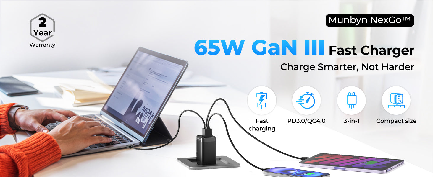 MUNBYN NexGo™ 65W GaN III 3-Port USB C Charger Block