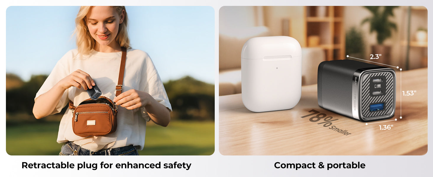- Compact & Portable: easily fitting into pockets or bags and 78% smaller than standard models, it features a foldable plug and lightweight design, making it perfect for home, office, or travel