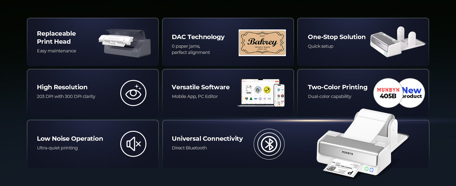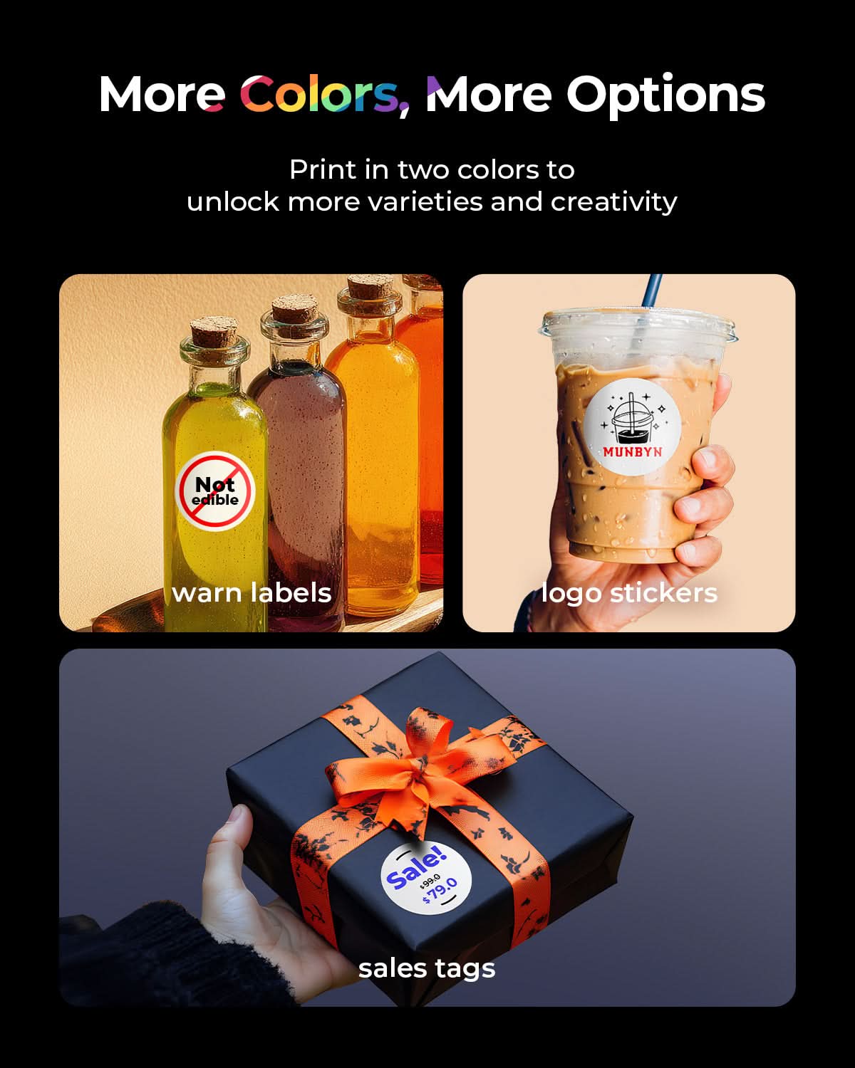 -Exclusive Dual-Color Label Power: Elevate your branding with MUNBYN Black/Red or Black/Blue dual-color labels (sold separately). Create striking two-tone designs effortlessly using our free apps – make your labels stand out!