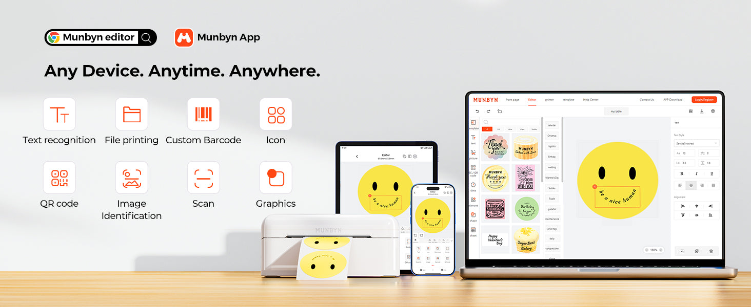 More than just an efficient logistics tool, this printer is your brand's creative engine. It perfectly supports shipping label printing, while also allowing you to create home organization stickers, brand decoration stickers, and more. Its built-in Advanced printing algorithm ensures every print is crisp and precise, rendering everything from barcodes and text to complex graphics with perfect clarity. With our free and powerful MUNBYN Print application, you gain access to a library of over 3,500 elements, 2,000 templates, and 80 fonts to effortlessly customize unique labels for any occasion. The app also supports PDF/TXT file imports and OCR text recognition, providing a seamless, multi-platform editing experience.