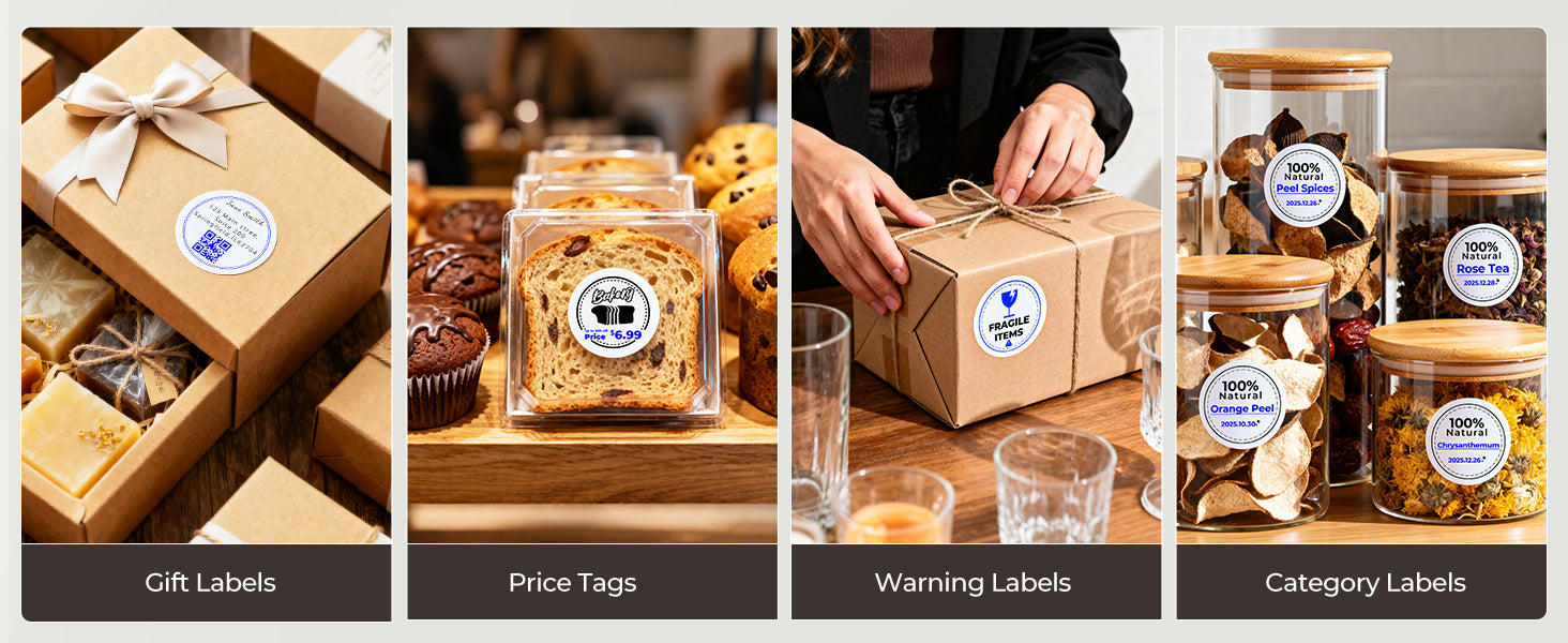 Logo stickers, thank-you labels, QR codes, product info labels.