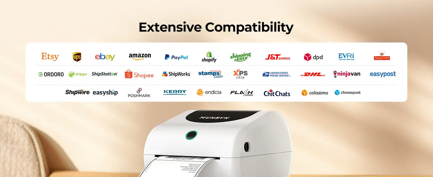 - Wide Compatibility: Thermal shipping label printer integrates seamlessly with USPS, UPS, eBay, Etsy, Shopify, Amazon, PayPal, and Poshmark, making it perfect for online sales and package deliveries. (Includes a driver USB Flash Drive; simply insert it into your PC to download the driver and start printing).