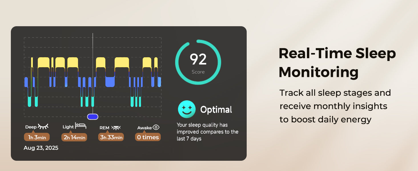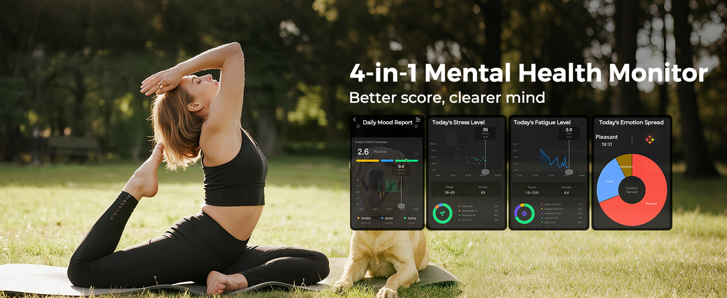 - 4-in-1 Mental Health Tracker: Monitors your mood, stress, fatigue level, and emotion, enabling you to understand your mental health status clearly and make timely adjustments