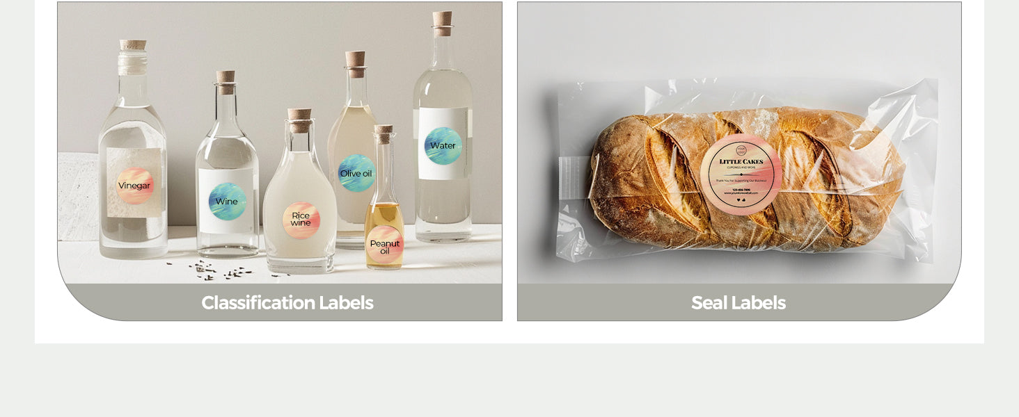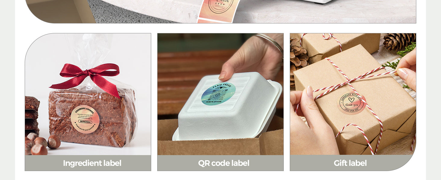 Logo stickers, thank-you labels, QR codes, product info labels.