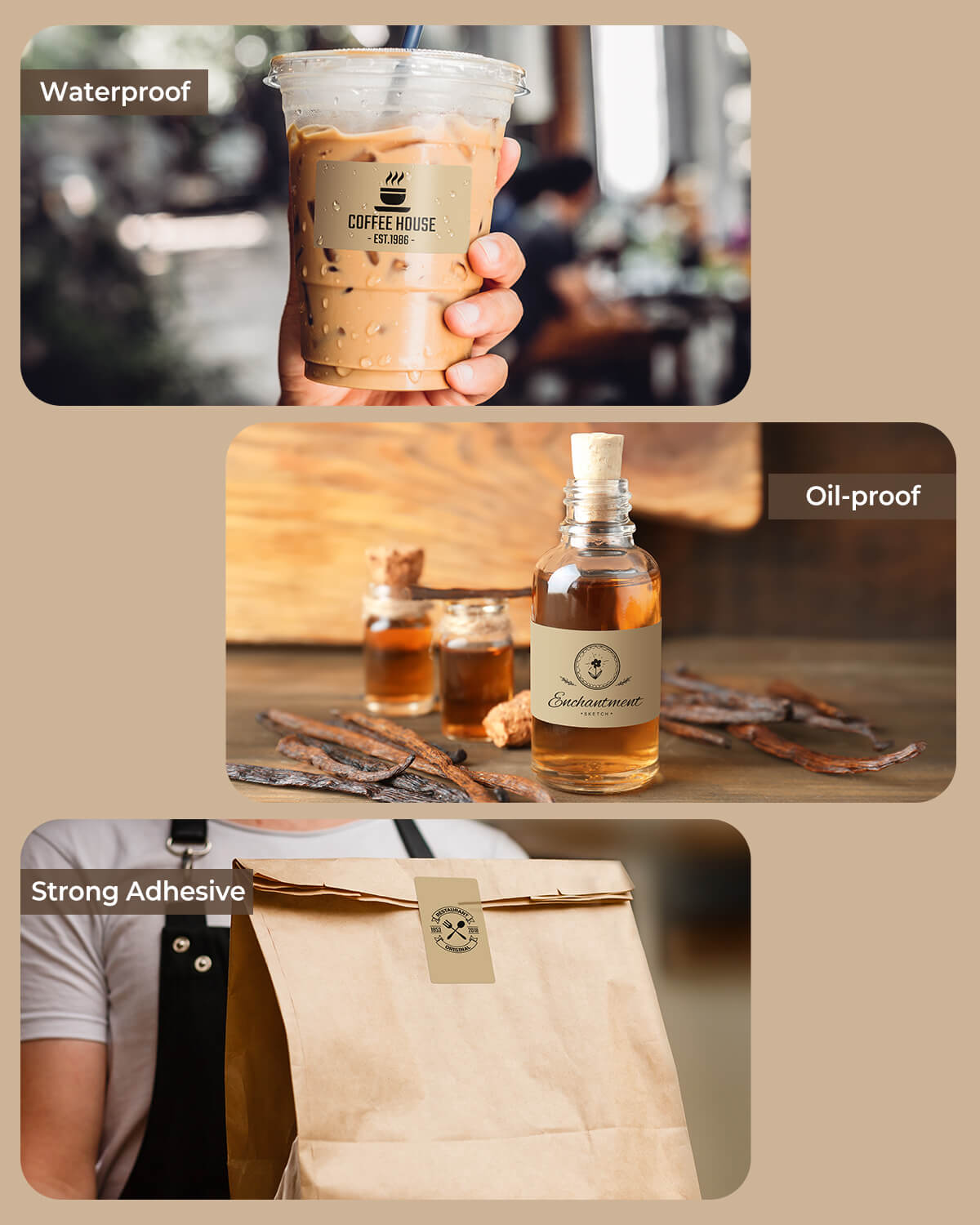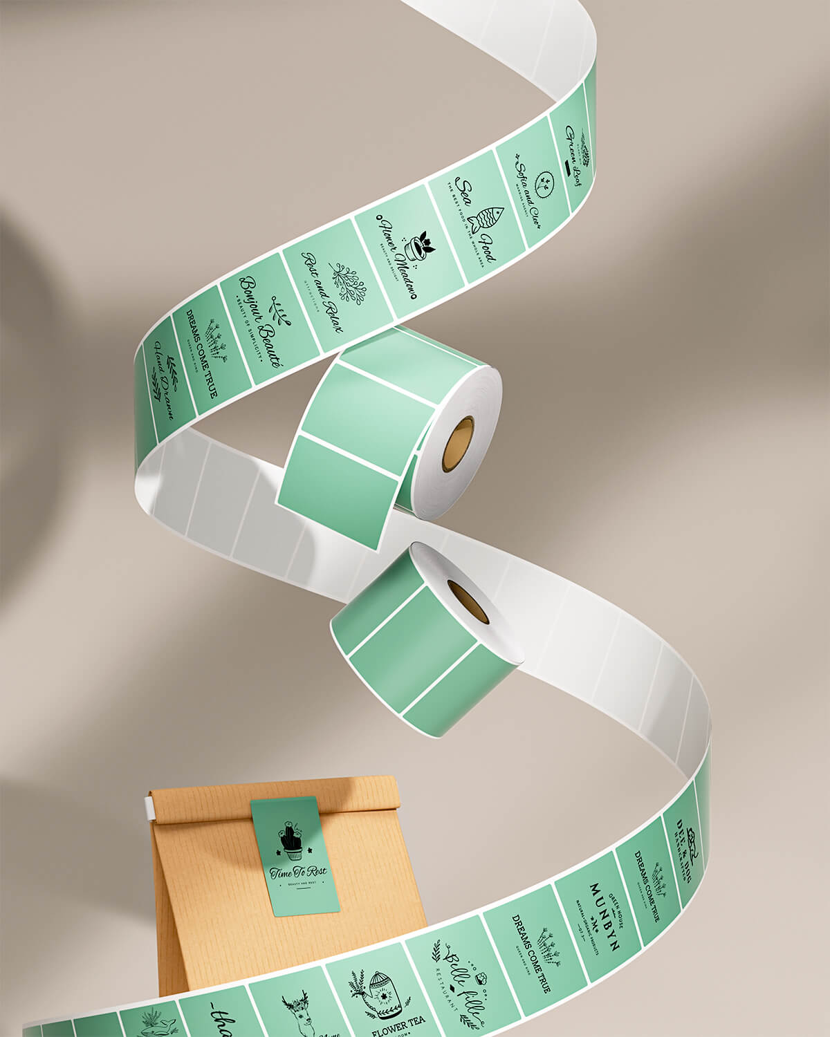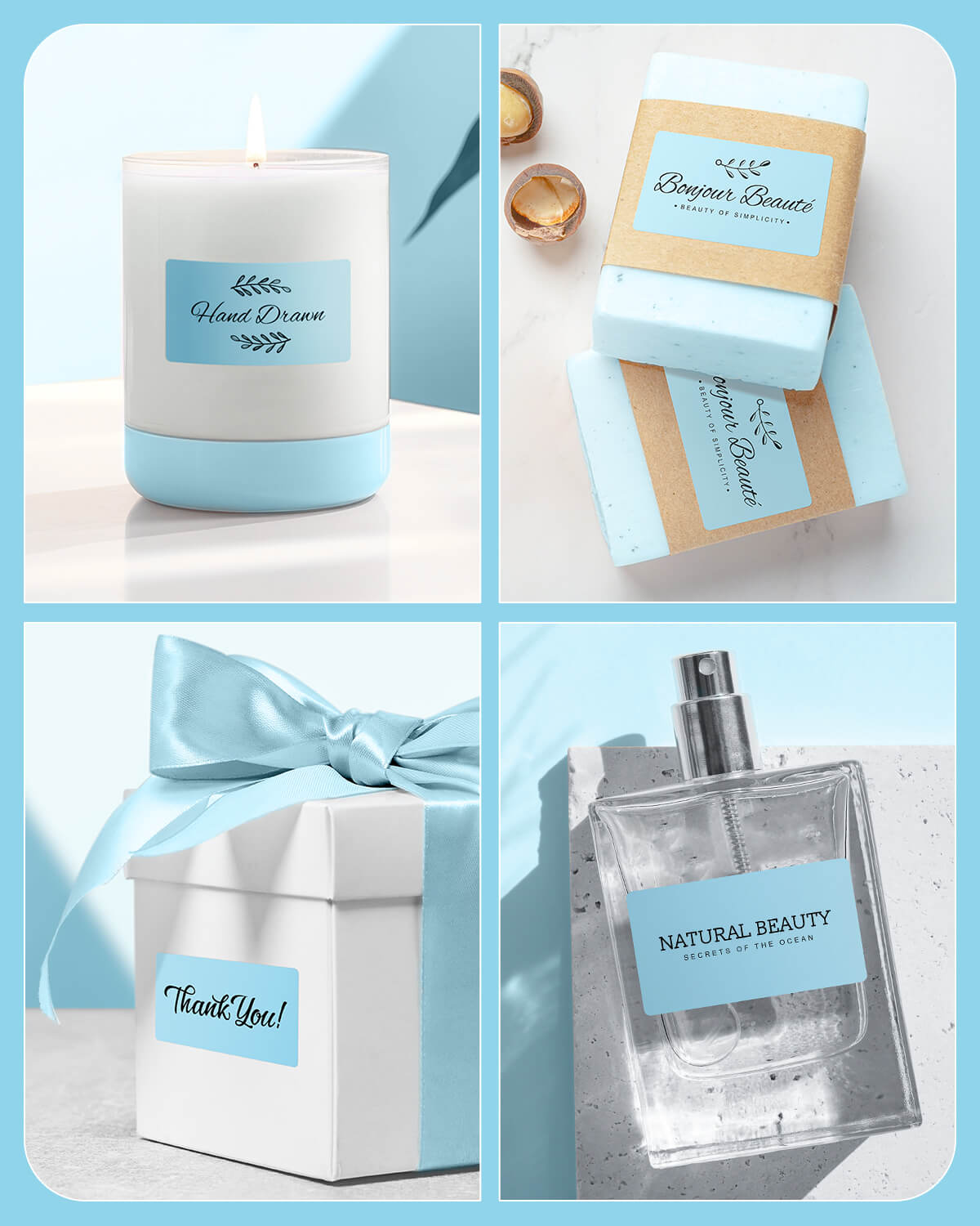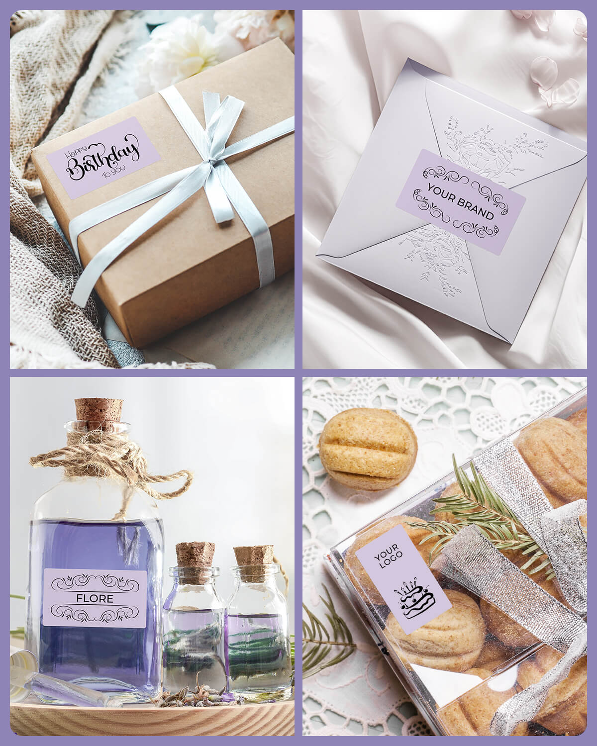 Logo stickers, thank-you labels, QR codes, product info labels.
