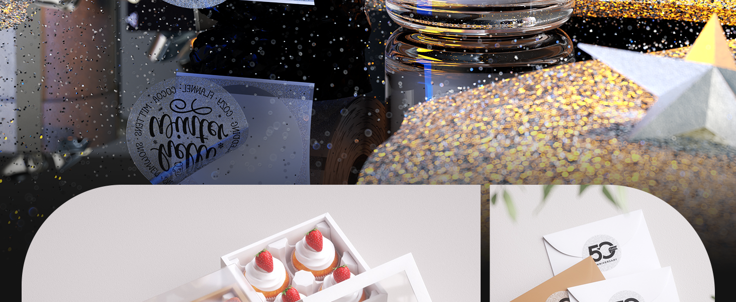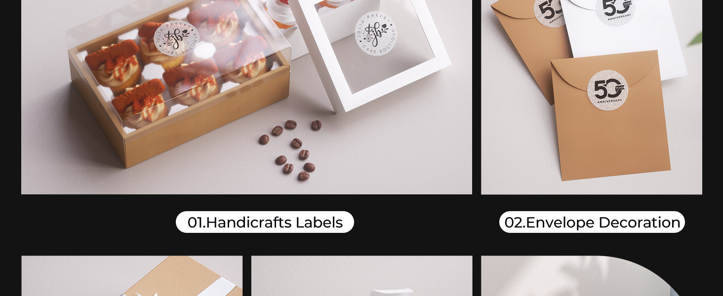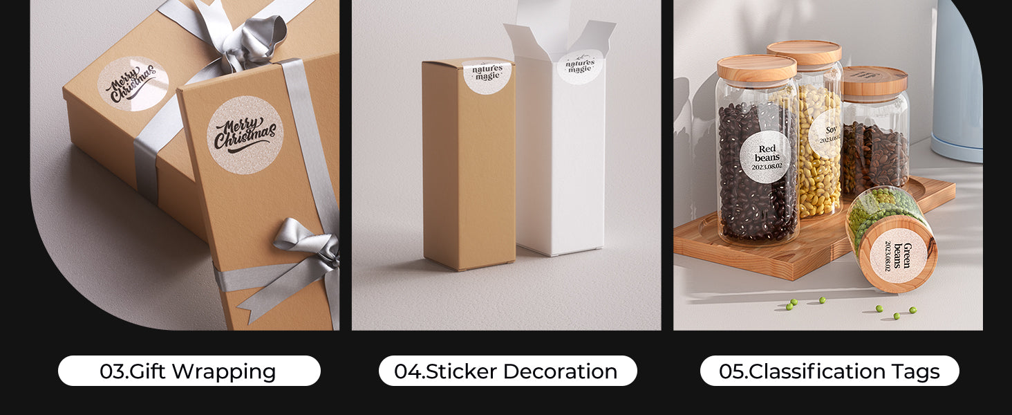 Logo stickers, thank-you labels, QR codes, product info labels.